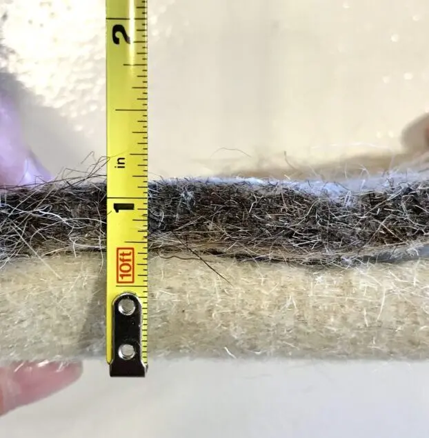 Our 100% all-natural, felted sheep wool insulation is approximately 3/4 inch thick (see photo) and is heavily cleaned until its color is a beautiful, almost snow-white. There is NO brown or black felt here! Our felt insulation is fire- and bug-resistant, has limited odor, and is as dense as it gets.